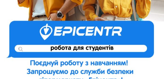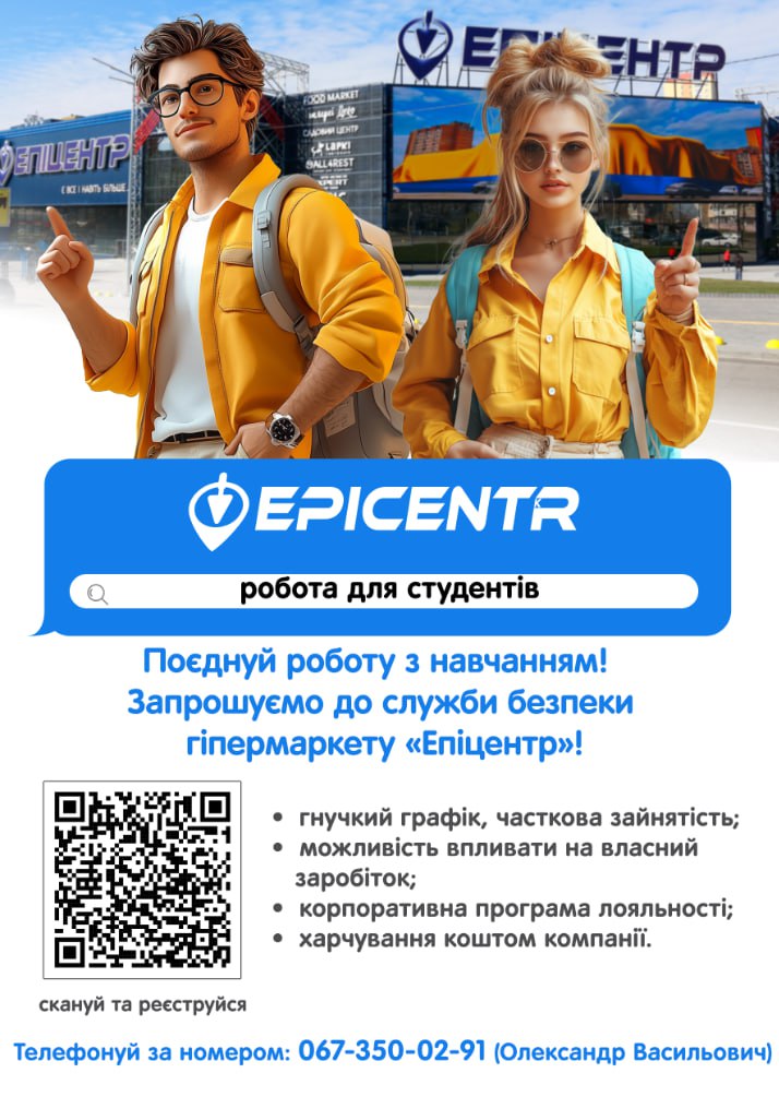Служба безпеки гіпермаркету ТОВ «Епіцентр К» оголошує набір студентів нашого ВУЗу для роботи на посадах охоронців гіпермаркету. Переваги роботи в ТОВ «Епіцентр К»: офіційне працевлаштування гнучкий графік роботи з урахуванням потреб начального процесу, оплата праці понад 16 тис.грн. (на руки, після сплати податків та інших платежів ), дворазове харчування тощо. За детальною інформацією звертайтесь за […]